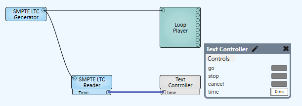 In this example, we are using a SMPTE LTC Reader to synchronize the Loop Player's Start, Stop, and Cancel according to a specific time.