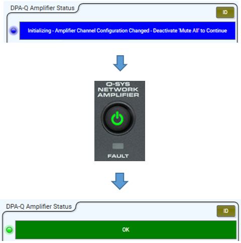 You can simulate a hot swap of a failed amplifier by performing a factory (pinhole) reset of the amp and any other peripheral for which you configured Dynamic Pairing. After about 20 seconds, the amplifier returns to its previous mode of operation. The only required user interaction is to press the Power button on the front panel, which takes the amp out of Safety Standby (blue):