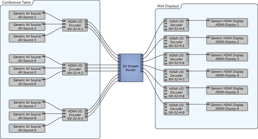 In this example, we have a very large conference room with three NV-32-H Encoders for attendees to connect HDMI sources, such as laptop PCs. On the wall are six large displays to show meeting content, each with a connected NV-32-H configured as a Decoder. Using the AV Stream Router, any AV stream from the Encoders can be routed to any Decoder and its display.